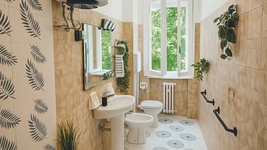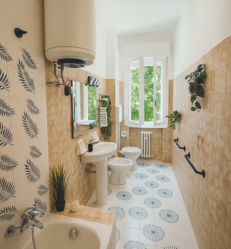 Clean and welcoming bathroom, featuring natural tones, and an open window with a green view.
